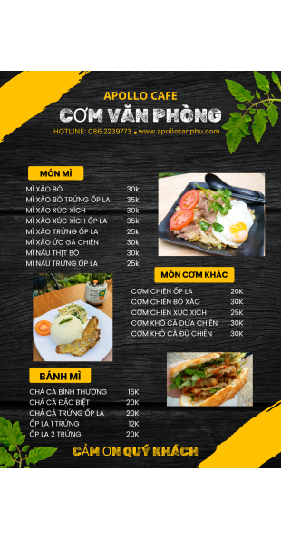 Apollo chuyên cung cấp phần cơm cho văn phòng công ty với menu đa dạng hơn 20 món ăn thay đổi hàng ngày nhằm đem lại giải pháp tiện lợi, ít tốn thời gian dùng bữa hơn cho doanh nghiệp Làm ra bữa ăn gia đình ngay tại nơi làm việc với chất lượng cao và chi phí tốt nhất nhất. Giúp cho mọi người ăn ngon, sống khoẻ, vui vẻ và làm việc hiệu quả. Freeship trong Quận Tân Phú từ 5 phần trở lên.